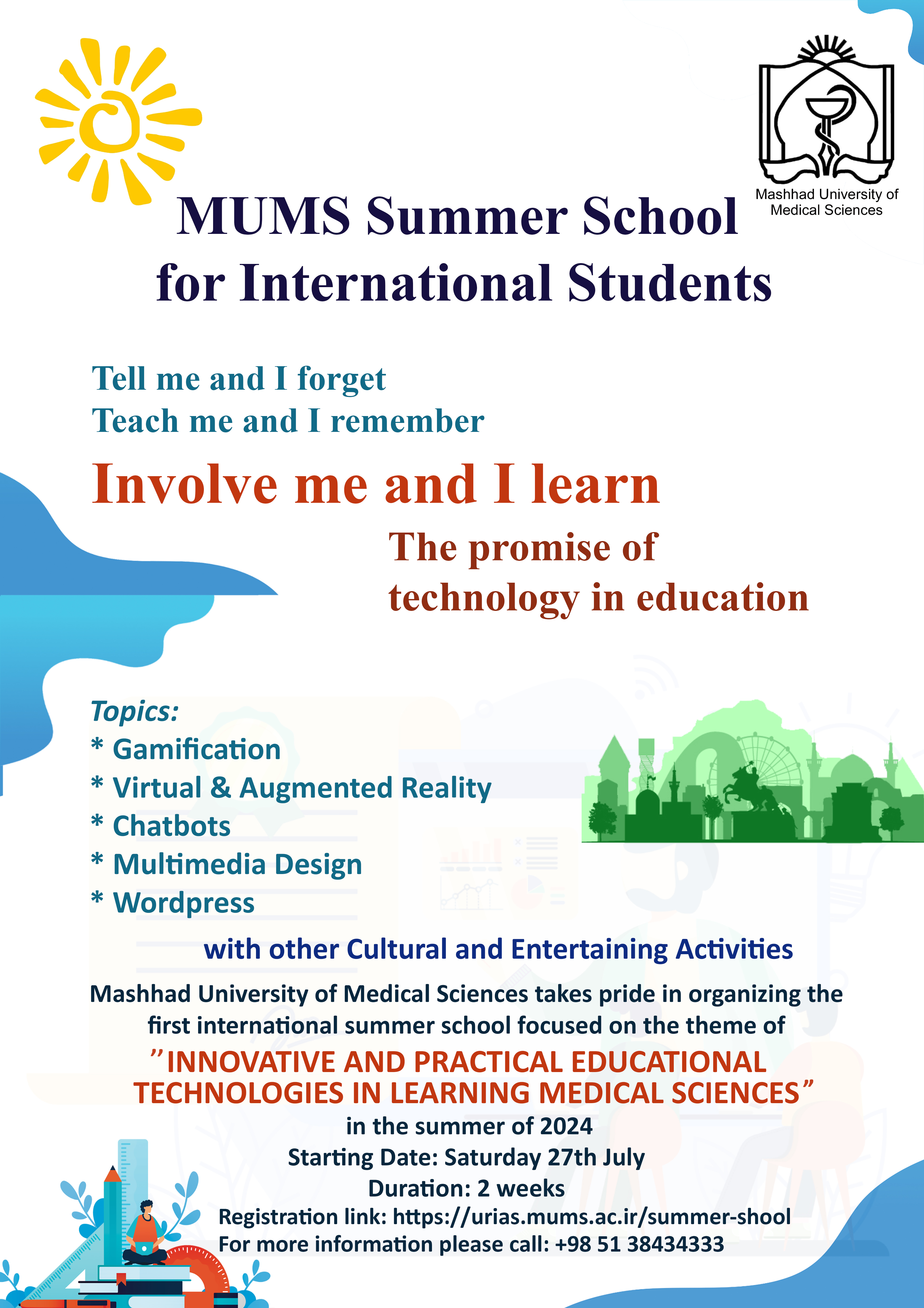 معاون بین الملل دانشگاه علوم پزشکی مشهد، از برگزاری نخستین دوره مدرسه تابستانه بین المللی در مرداد ماه سال جاری در این دانشگاه خبر داد.